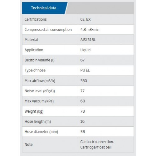 The ATEX vacuum is suitable for various cleaning and liquid pick-up operations in heavy industry, tank stripping and off-shore. All parts of the vacuum cleaner are anti-static and conductive to avoid static electricity loading. Designed for stripping of cargo tanks and deep well sumps in shipping.